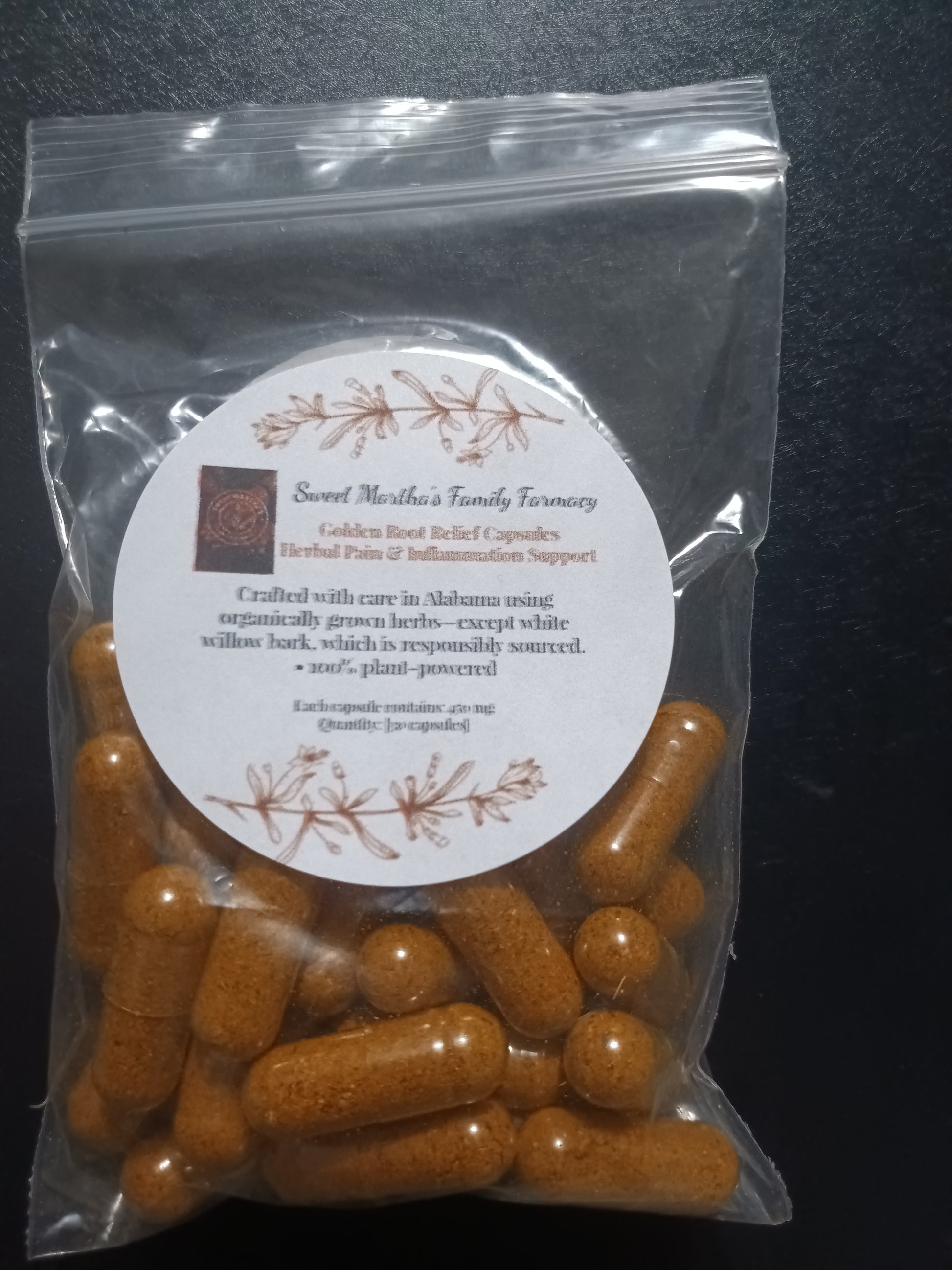 Turn down the heat on pain with this golden blend of turmeric, ginger, garlic, white willow bark, valerian, and black pepper. Packed into 00-sized vegetarian capsules, this formula delivers anti-inflammatory and calming support from root to bark. Made with organic herbs grown at Sweet Martha’s Family Farmacy, it’s your plant-powered ally for natural relief.