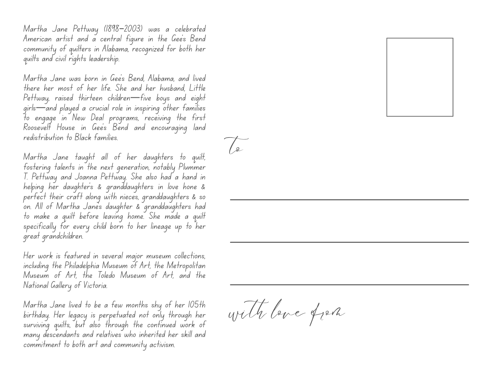 Celebrate the artistry and activism of Martha Jane Pettway (1898–2003), a matriarch of Gee’s Bend and a guiding force in American quilting. This beautifully designed postcard honors her legacy with a heartfelt biography on one side and a traditional message layout on the other—perfect for gifting, collecting, or sending love across generations.
